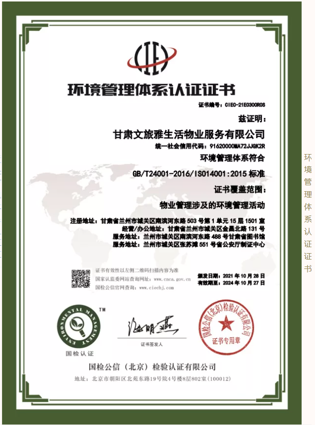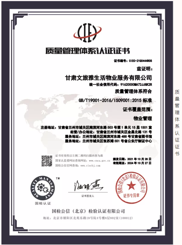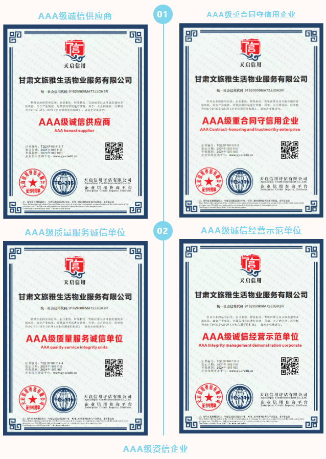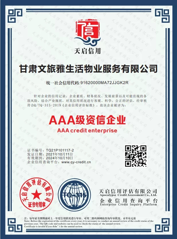 2021年,甘肅文旅雅生活物業(yè)服務(wù)有限公司認(rèn)真貫徹落實習(xí)近平新時代中國特色社會主義思想,堅決落實集團(tuán)公司各項決策部署。按照集團(tuán)公司高質(zhì)量發(fā)展要求,結(jié)合自身發(fā)展需要,公司于9月份正式啟動3A體系認(rèn)證工作,經(jīng)過權(quán)威認(rèn)證機構(gòu)對公司信用管理、制度建設(shè)、管理體系等方面綜合評估,10月底公司順利通過3A體系認(rèn)證,使得公司在管理水平、制度建設(shè)方面有了進(jìn)一步完善及提升,增強了公司核心競爭力和品牌影響力,為公司高質(zhì)量發(fā)展奠定了堅實的基礎(chǔ)。