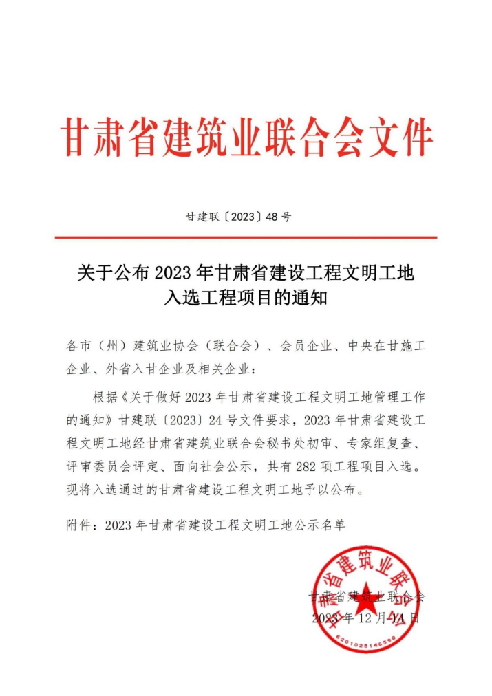 近日,甘肅省建筑業(yè)協(xié)會(huì)發(fā)布2023 年甘肅省建設(shè)工程文明工地和甘肅省誠(chéng)信建造師評(píng)選結(jié)果,甘肅文旅集團(tuán)旗下子公司蘭州市政公司承建的渭源縣渭河源景區(qū)旅游服務(wù)能力提升項(xiàng)目、蘭州石佛溝生態(tài)旅游示范區(qū)一期工程、熱電聯(lián)產(chǎn)城市一次供熱管網(wǎng)建設(shè)項(xiàng)目(西固區(qū))、甘肅瑪雅冰川礦泉水股份有限公司年產(chǎn)18萬(wàn)噸天然水開(kāi)發(fā)項(xiàng)目、張掖平山湖大峽谷景區(qū)旅游基礎(chǔ)設(shè)施建設(shè)項(xiàng)目、涼州區(qū)職業(yè)中等專業(yè)學(xué)校 學(xué)生住宿樓建設(shè)項(xiàng)目6項(xiàng)工程獲得2023年“甘肅省建設(shè)工程文明工地”榮譽(yù)稱號(hào)。王峰、李方乾、王立學(xué)、馮力爭(zhēng)、劉雙亮5名同志獲得“甘肅省誠(chéng)信建造師”榮譽(yù)稱號(hào)。