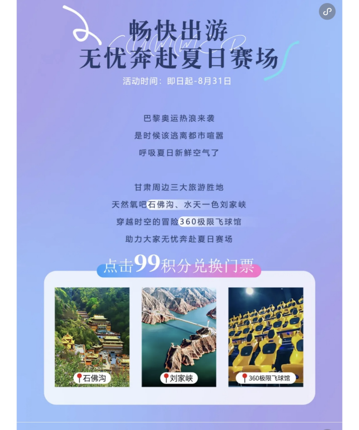 首期活動(dòng),運(yùn)營(yíng)集團(tuán)精選蘭州石佛溝國(guó)家森林公園(國(guó)家AAAA級(jí)旅游景區(qū))、劉家峽恐龍國(guó)家地質(zhì)公園(國(guó)家AAAA級(jí)旅游景區(qū))及蘭山360極限飛球三家景區(qū)場(chǎng)館參與活動(dòng)。期間,吾悅廣場(chǎng)室內(nèi)外大屏也將滾動(dòng)播放景區(qū)場(chǎng)館的宣傳影片,供廣大消費(fèi)者了解景區(qū)場(chǎng)館詳細(xì)信息。后續(xù),運(yùn)營(yíng)集團(tuán)將根據(jù)市場(chǎng)反饋與實(shí)際情況,不斷調(diào)整、更新活動(dòng)場(chǎng)館,為廣大消費(fèi)者帶來更加豐富多元、新鮮有趣的旅游體驗(yàn)。